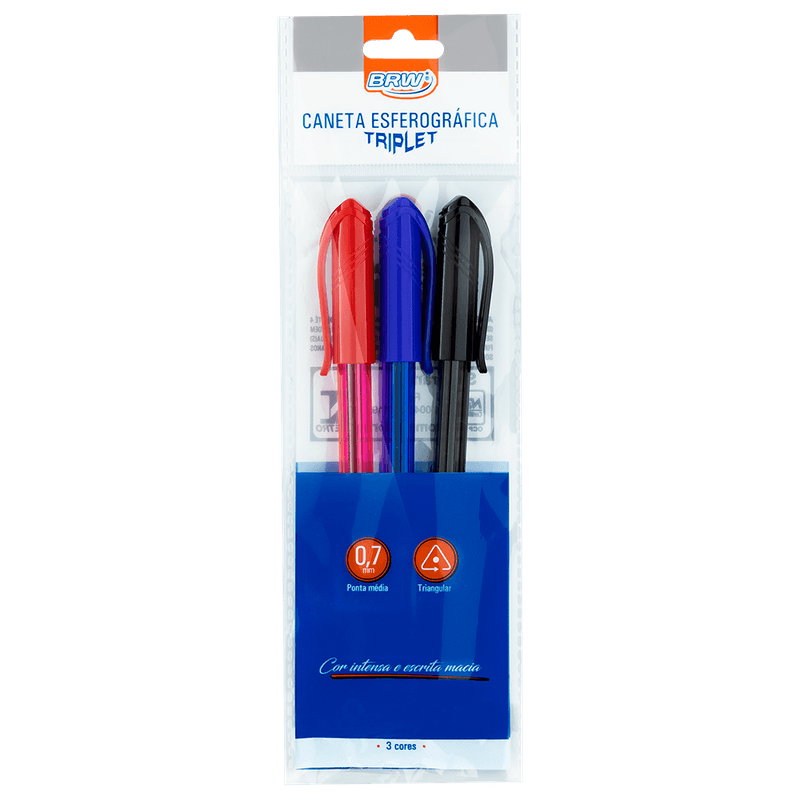 Ponta de 0,7 mm resistente e com escrita macia. Corpo translúcido na cor da tinta e triangular, assegurando agilidade e conforto durante o uso. Tinta com cor intensa, alta durabilidade e secagem rápida. Conta com orifício de ventilação na tampa traseira, evitando o entupimento e o ressecamento da tinta. Caneta Esferográfica