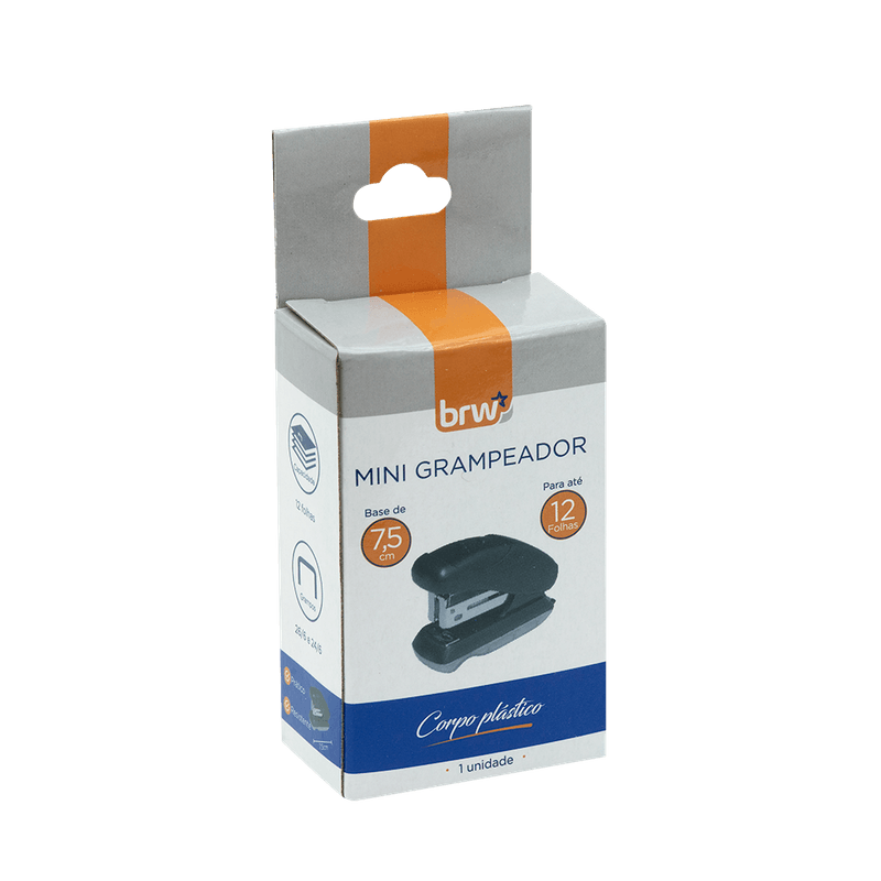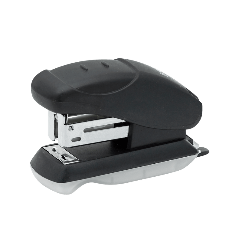 Estrutura interna metálica em aço com corpo e base plástica. Design moderno, prático e resistente Design confortável, resistente e durável. Base de fechamento na posição fechada. Grampeador Plástico Mini